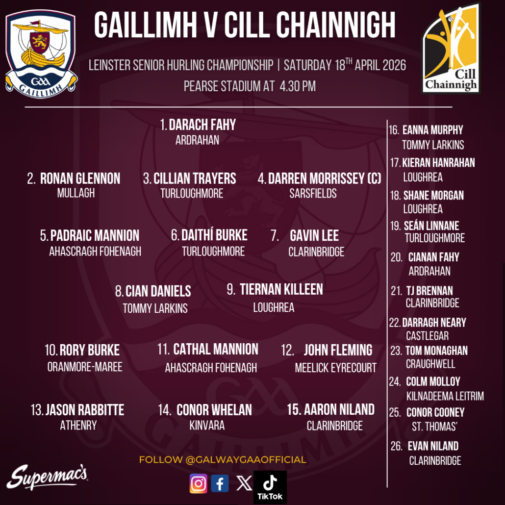 The Galway Senior Hurling team to face Kilkenny in the opening round of the Leinster SHC is announced!