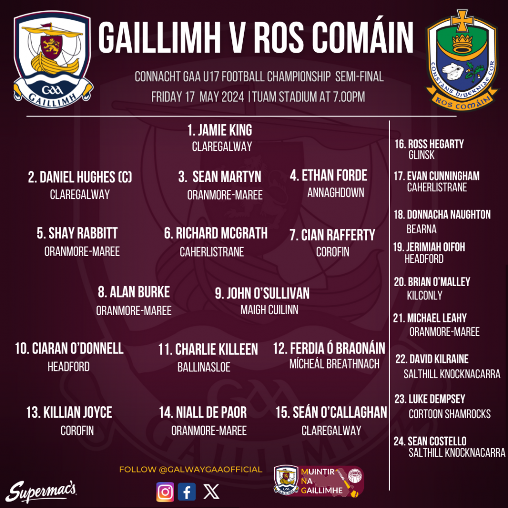 The Galway u17 Football team to face Roscommon in the Connacht U17 Football Championship Semi-Final is announced